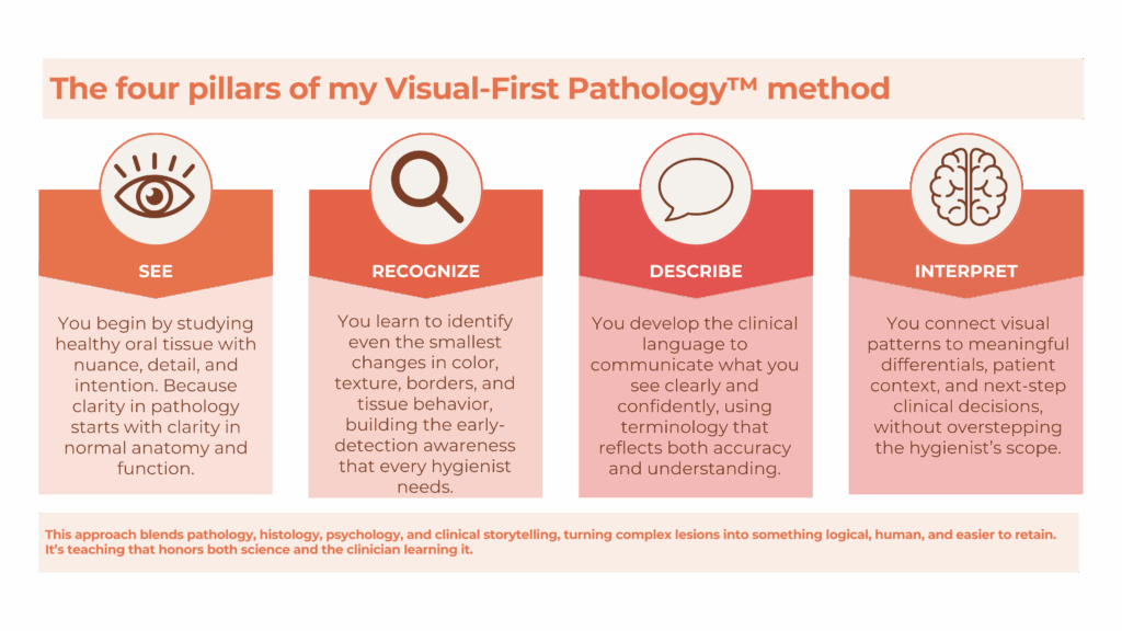 I blend clinical expertise, visual learning, and a deep passion for teaching dental hygienists how to see oral pathology with clarity, confidence, and compassion.